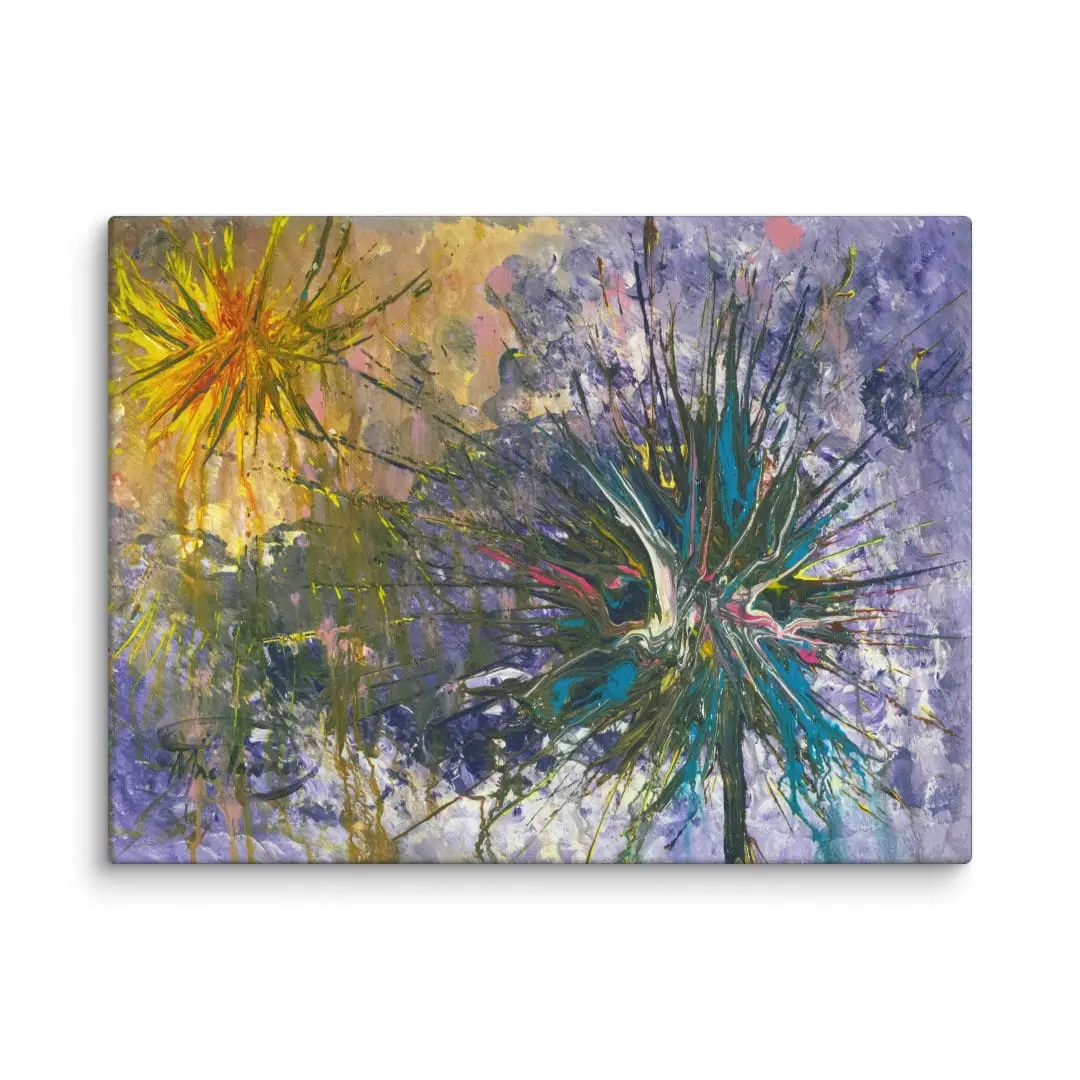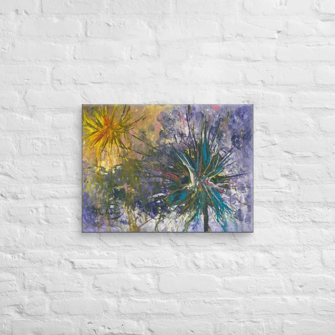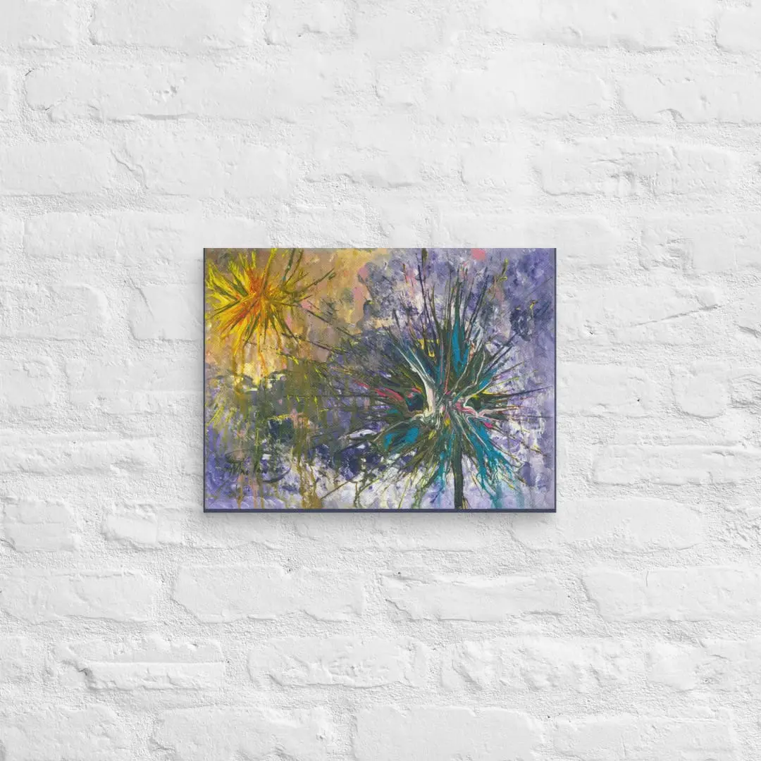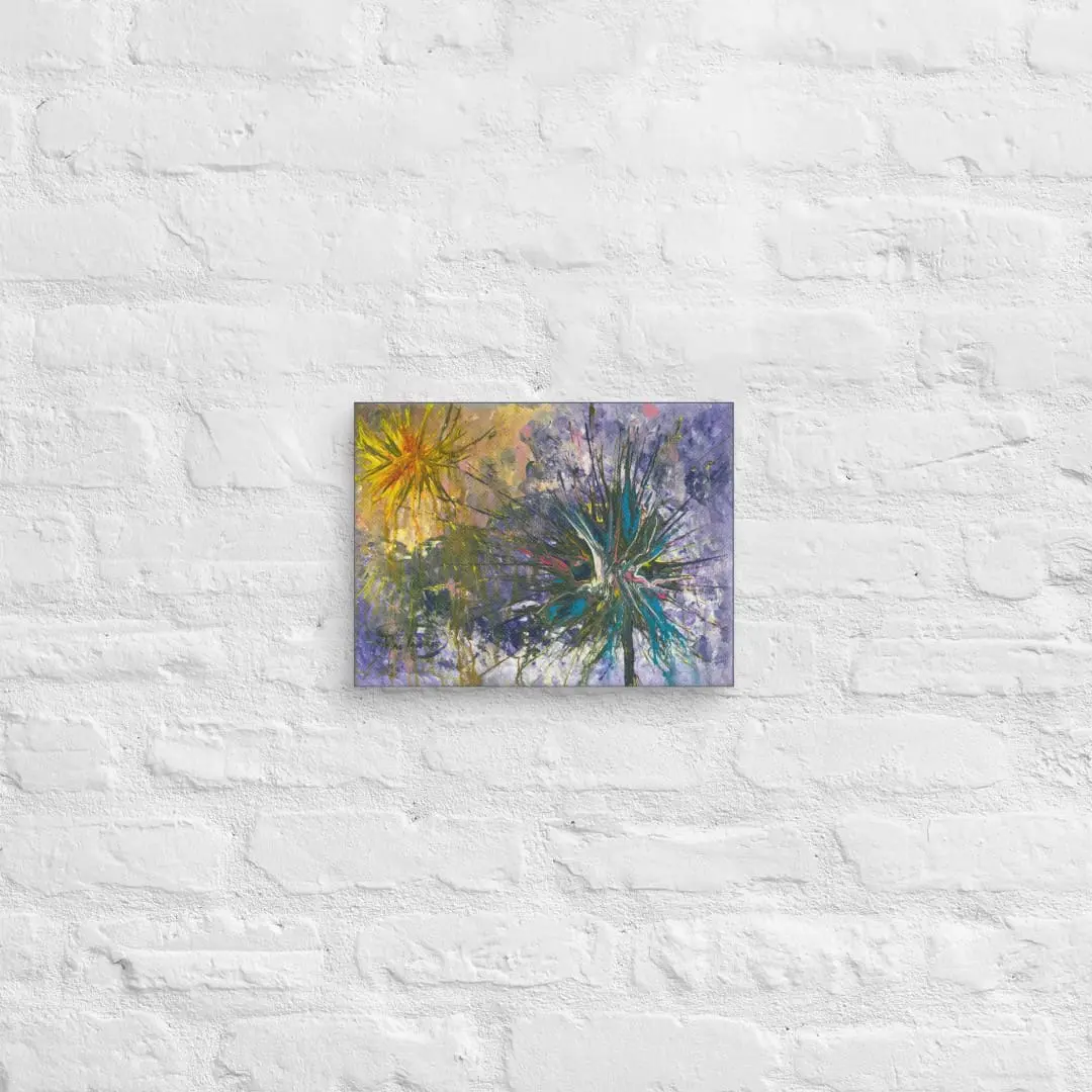 This fine art canvas print is created from Robert MacDonald’s original abstract painting Blue and Yellow Starbursts. Printed with archival-quality inks on gallery-grade textured canvas, layered strokes extend across the surface with depth, while bold passages of blue, yellow, and red contrast against the muted ground. The composition’s radiating structure produces a strong contemporary presence suitable for a variety of interiors.