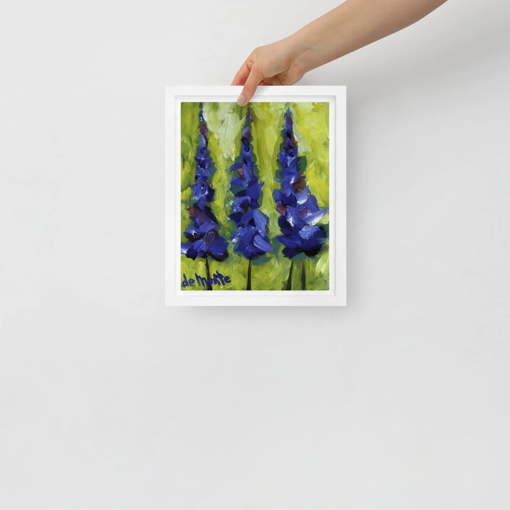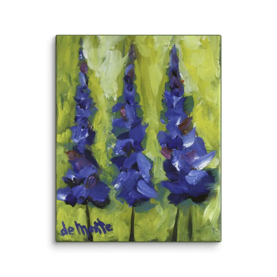 This artwork is a vibrant, impressionistic painting of three tall, purple flowers standing against a green background. The flowers are rendered with bold, broad brushstrokes that convey movement and texture. The stems of the flowers are slender and support clusters of petals that transition in tone from deep purple to lighter shades with hints of blue and pink. The green background consists of various shades and strokes, creating a dynamic, almost abstract backdrop that contrasts with the vivid purple of the flowers, enhancing their prominence in the composition. The overall effect is dynamic and lively, embodying a sense of natural beauty and energy.