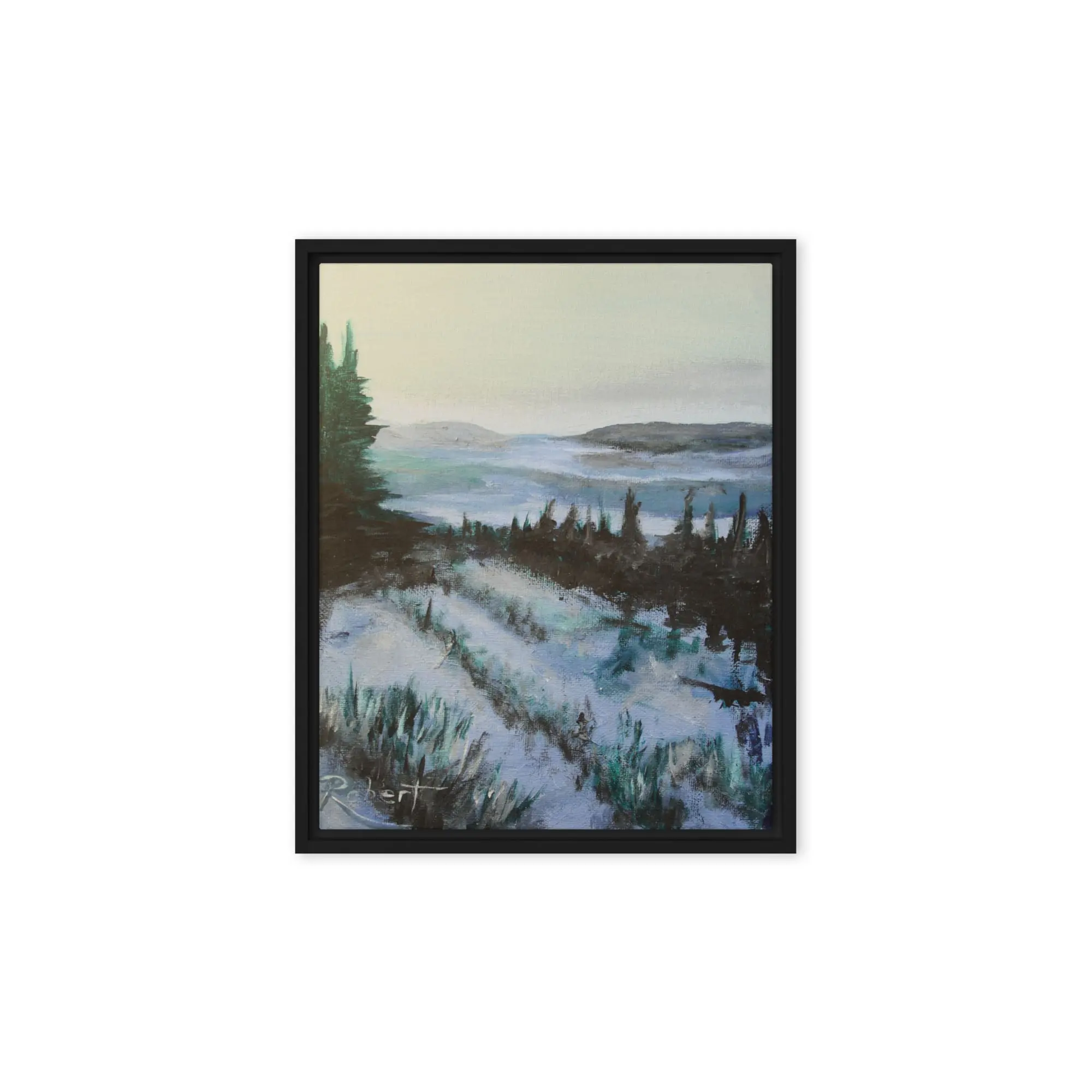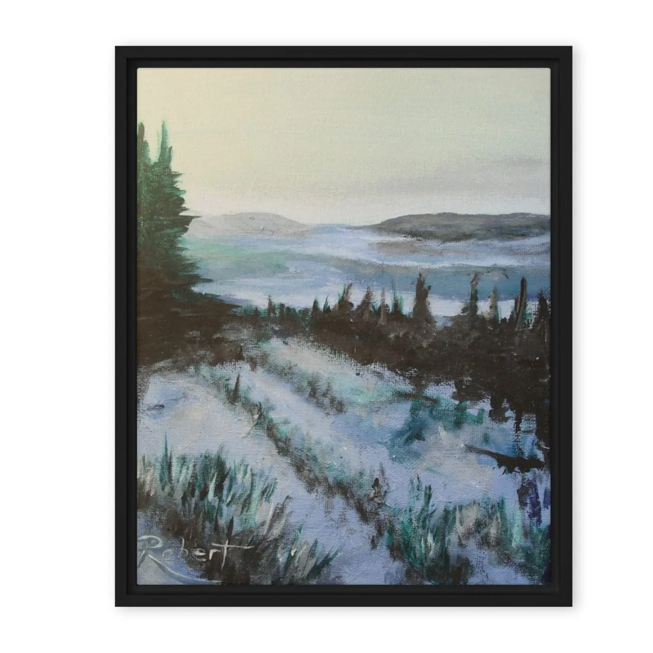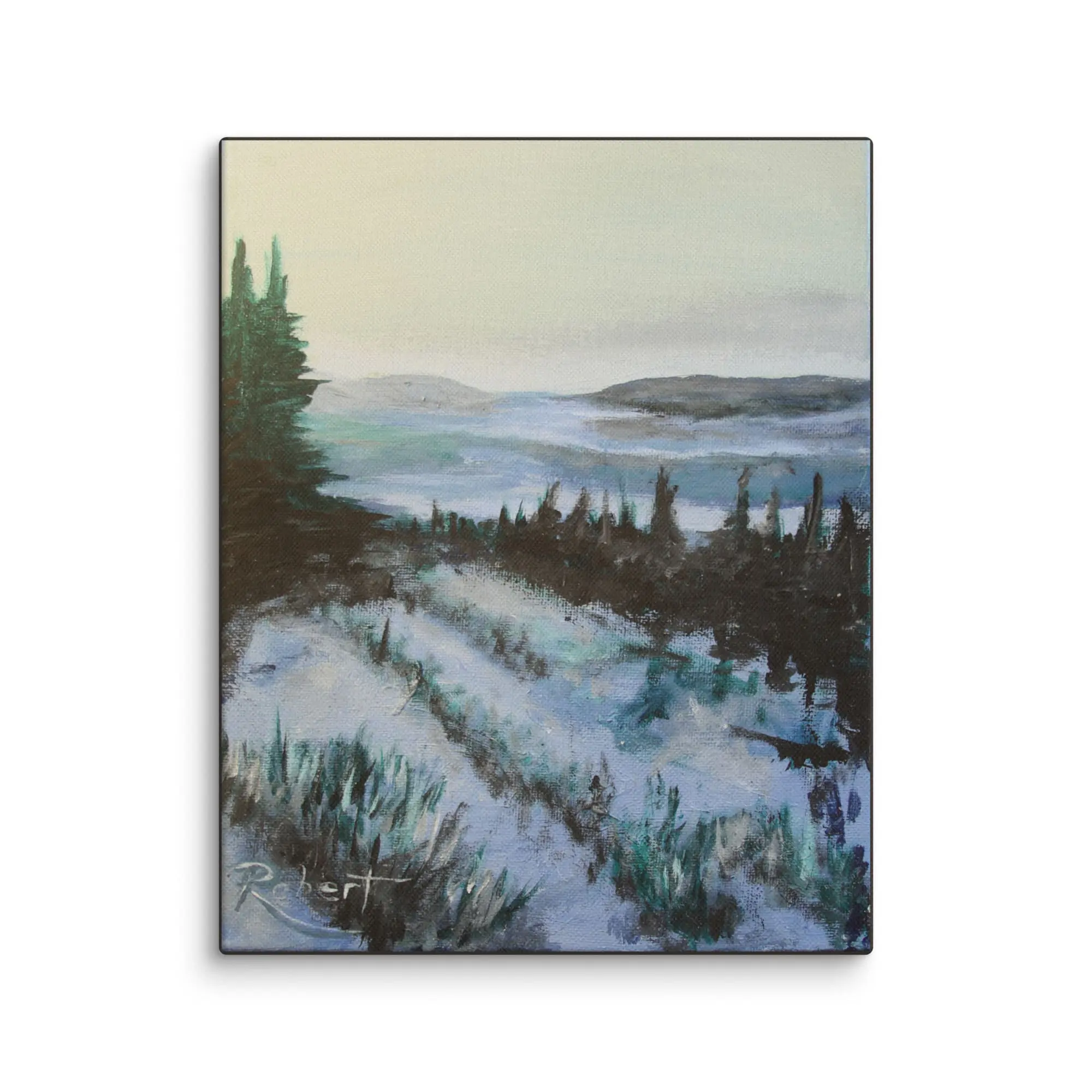 Yukon Winter is a serene landscape painting depicting a winter scene in The Yukon with snow-covered fields and rolling hills. It features tall, dark evergreen trees on the left, leading the eye towards the distant hills under a pale sky. The color palette is cool, with blues and whites dominating the scene, capturing the quiet beauty of a snowy countryside.