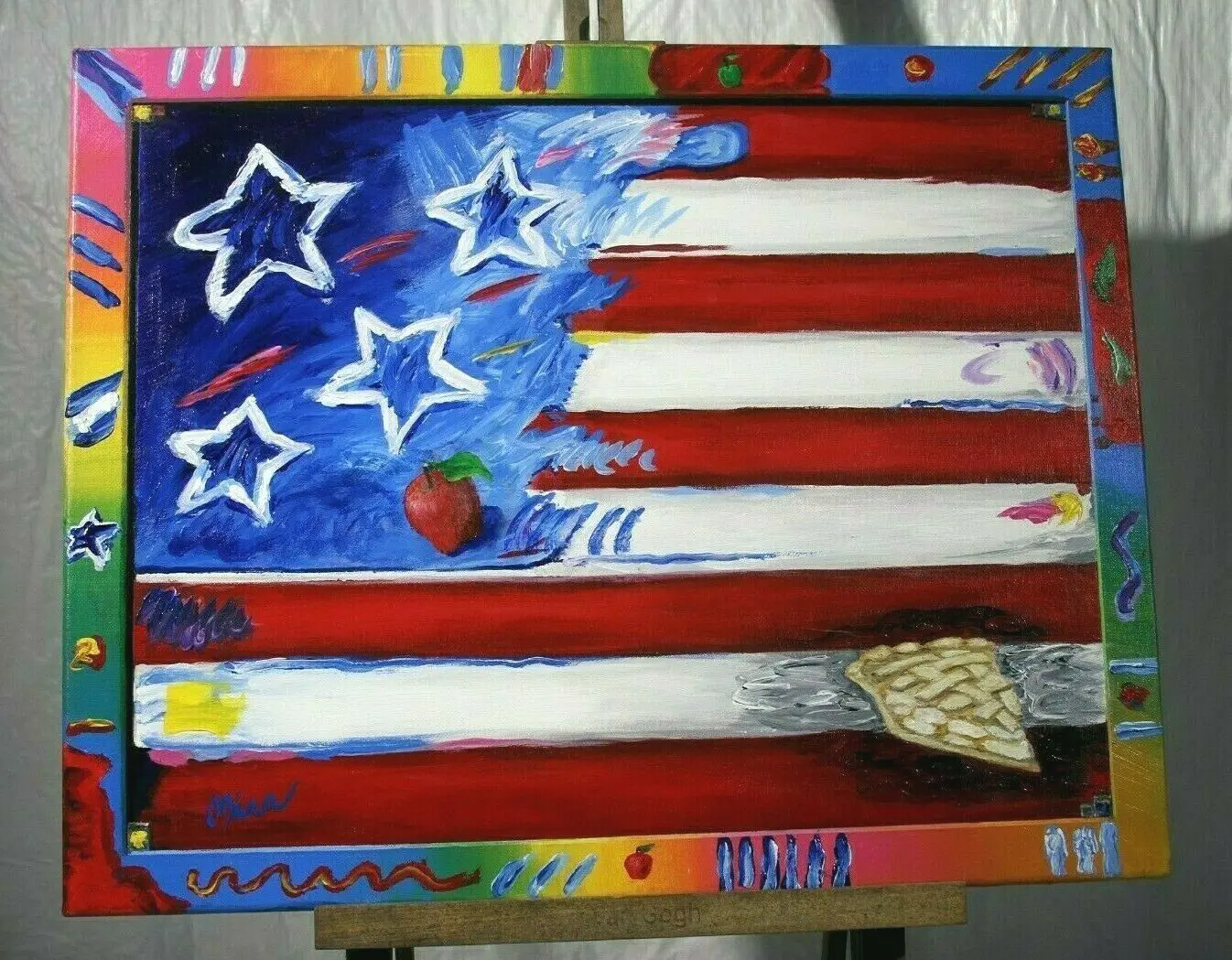 Mira’s latest collection is a take off from Peter Max’s painted frames. Like Peter Max, instead of being a wood finish the frames are painted to match and compliment the painting. Peter Max is most known for using this technique with his flag paintings. Mira has taken that a step further and applied it to a complete array of subjects. When available these Mira painted frame painting are listed in our Peter Max – Juan Mira Pop Art category.