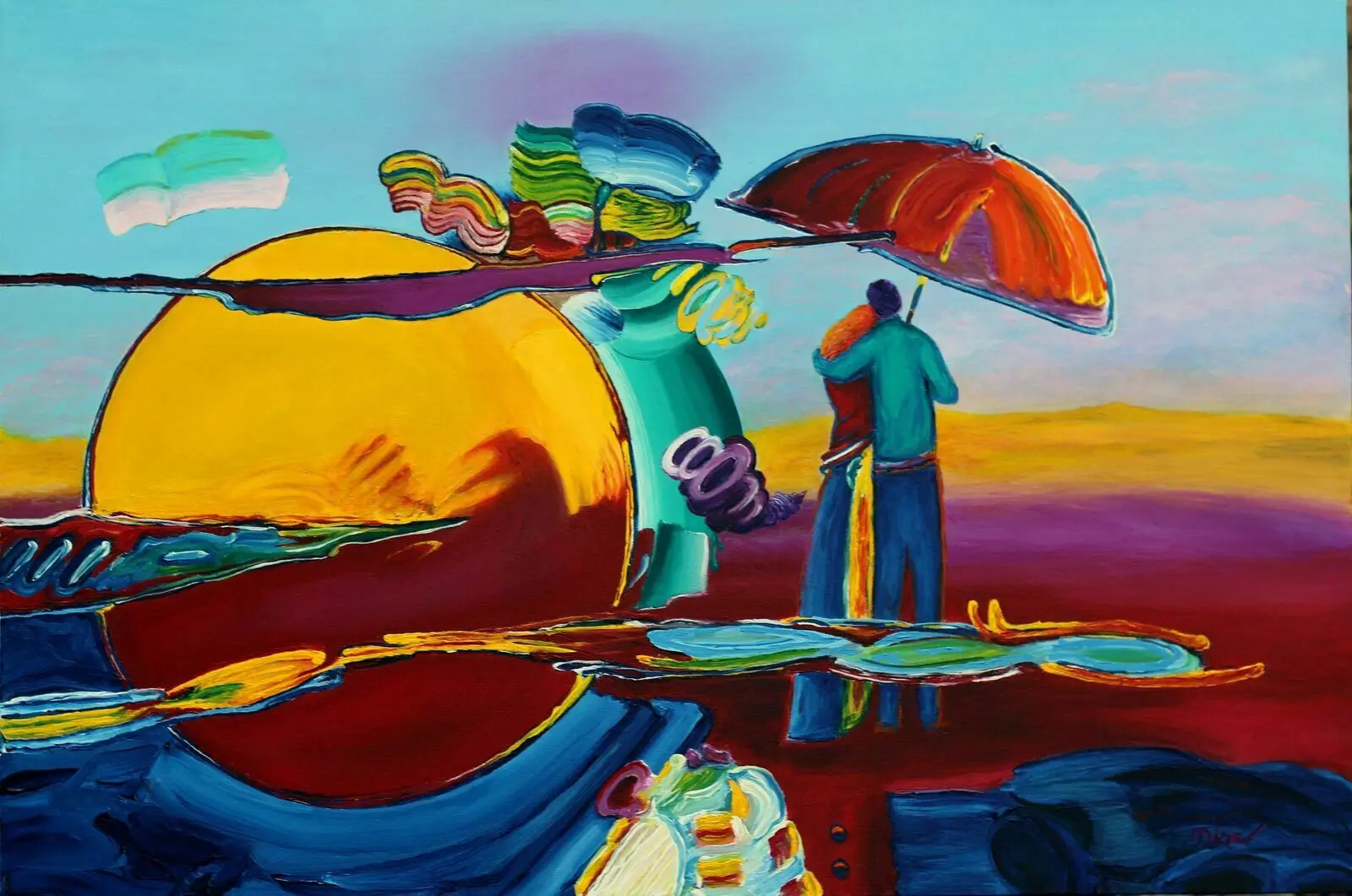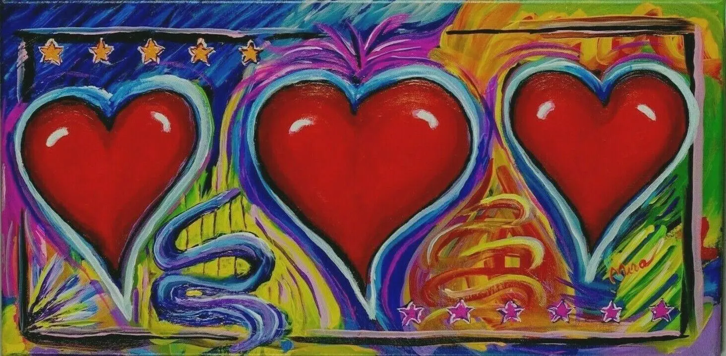 Like Peter Max, Mira paints in a contemporary Pop Art style featuring bold colors and broad strokes. He also keeps with many of the themes popularized by Peter Max such as people with umbrellas, galactic scenes, flowers, flags, hearts, and sunsets.