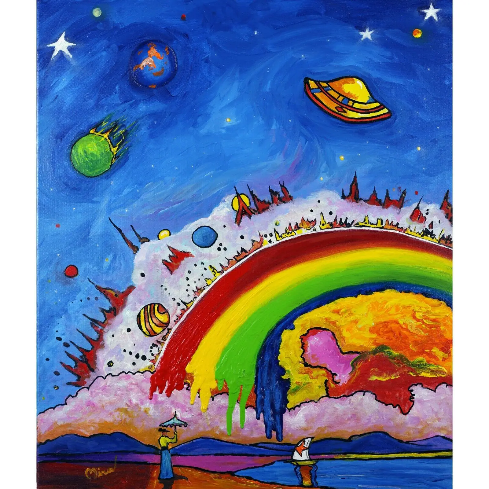 Umbrella Lady Under The Rainbow is an earthly landscape with a burst of colorful galactic intervention. Umbrella Lady is out for a “galactic” stroll under a colorful dripping rainbow. The two key elements that Mira changed were the Umbrella Lady and adding the predominantly colorful flowing Rainbow. This painting is available for in our Art and Paintings.