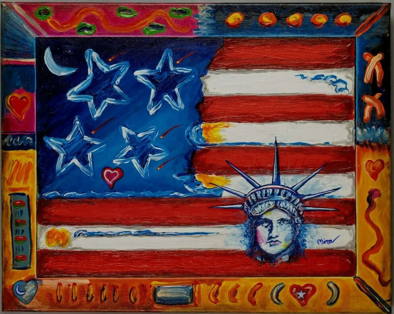 In US Liberty Flag with Heart and Moon it too appears to be in a frame that is painted to compliment the painting. Again Mira painted the whole image on canvas making it appear that it is in a painted frame. Further enhancing the illusion is that the frame area is varnished with a satin finish and the flag portion is varnished with a high gloss finish.