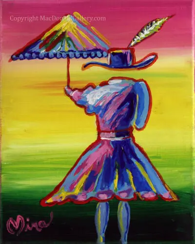 Artistically, the brush strokes are applied and the colors harmonize similarly to Umbrella Man. She holds an umbrella that geometrically reflects the shape of her dress. The umbrella is not round and smooth but shaped like “The Blade” which traditionally has symbolized manhood. She is accomplishing the same task as the man, but still maintaining her feminine physique. Her legs give a hint of sex appeal and her stylish large brimmed Fedora hat demonstrates her confidence. The feather represents her freedom to do and be whatever she wants.” A version of “Umbrella Girl is available in our Art and Paintings.