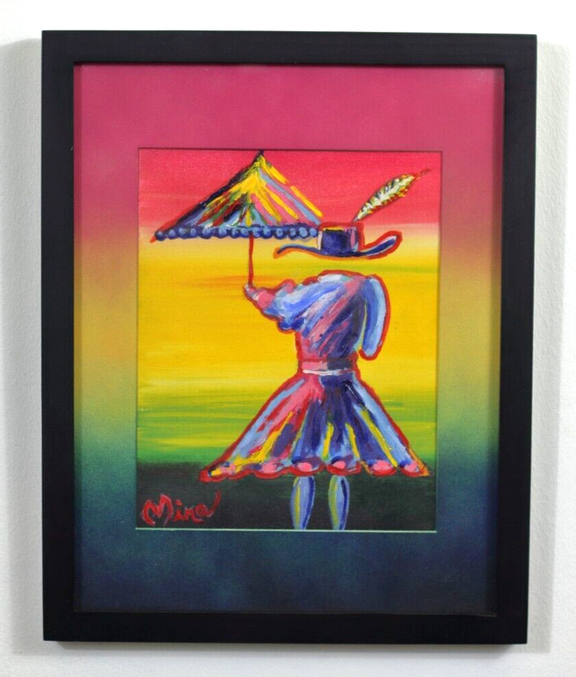 Juan Mira’s Umbrella Girl is a striking reinterpretation of Peter Max’s iconic Umbrella Man, transforming the familiar pop art figure into a confident, stylish female. While retaining the bold colors and dynamic brushstrokes characteristic of pop art, Mira introduces his own artistic flair by replacing Max’s male figure with a female counterpart. In this vibrant work, Umbrella Girl holds an umbrella that mirrors the geometric shape of her dress, deviating from the traditional round form of Max’s original to one that symbolizes a blend of femininity and strength.